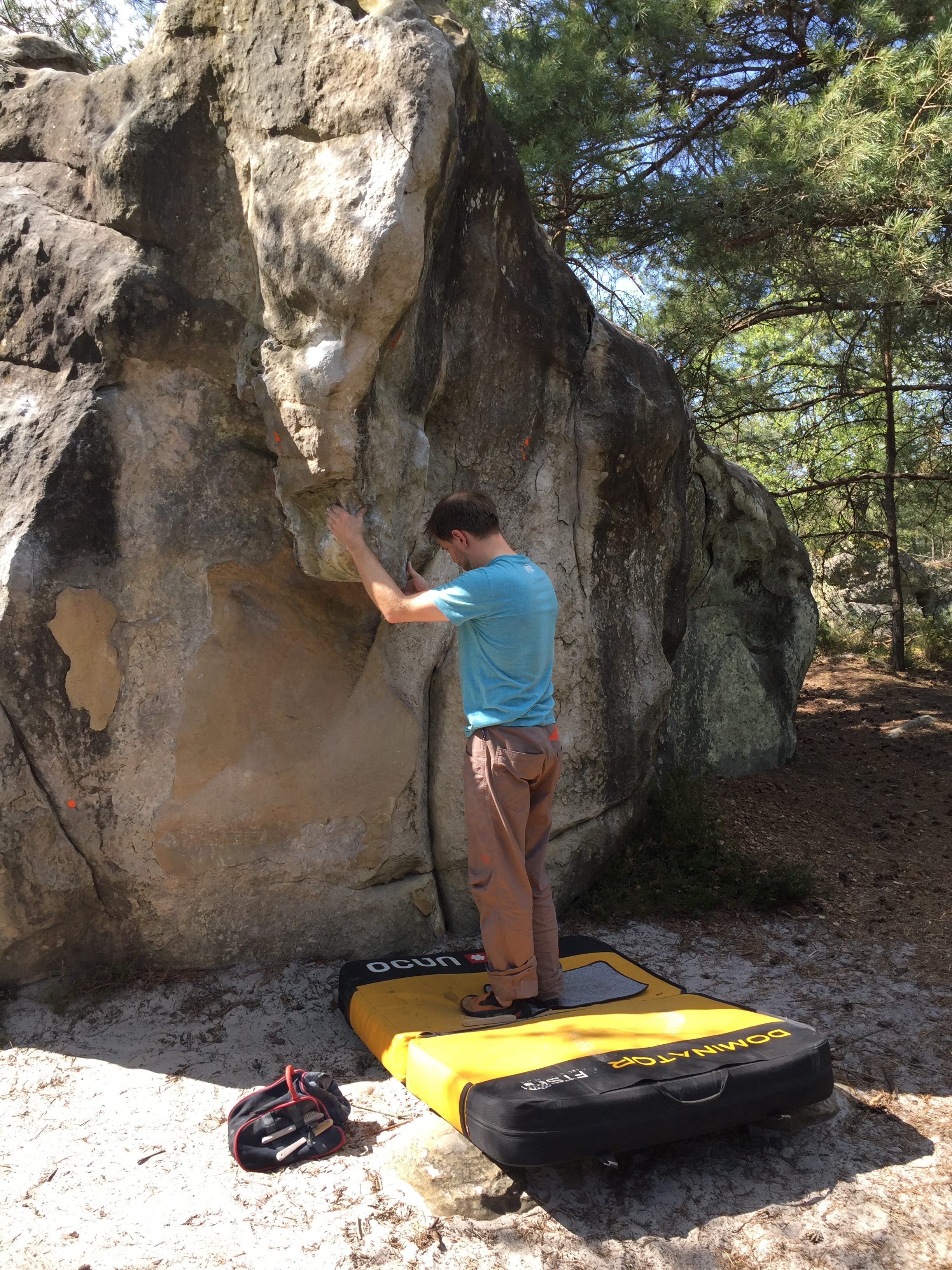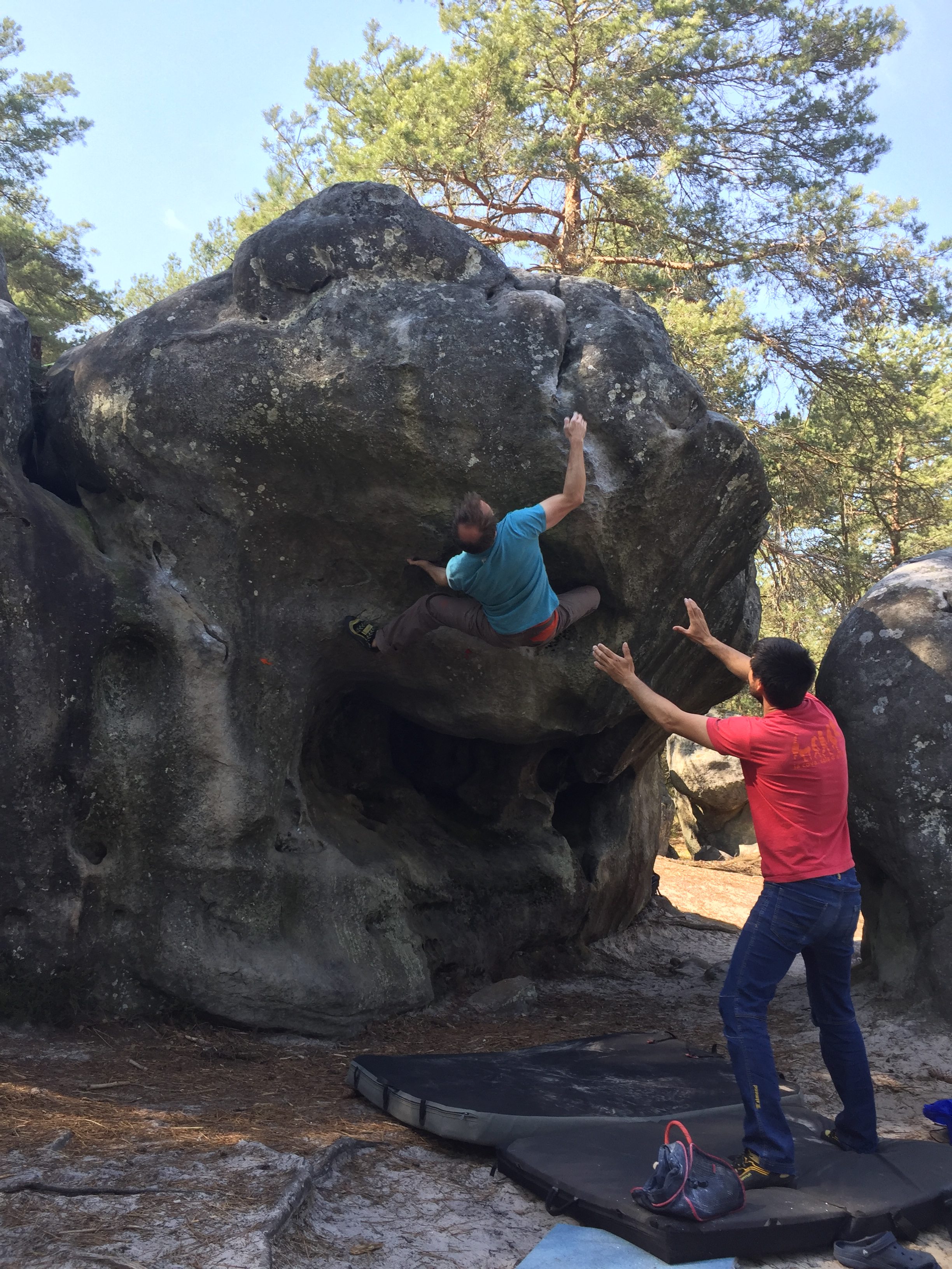 Viele „Bleau – Neulinge“ begleiteten uns dieses Jahr zum ersten Mal. An den Sandstein, der dir so einiges abverlangt. Guten Gripp hätte man ja, aber wo sind die Griffe?? Kleine Dellen, runde Sloper, mini Löchlein, hier und da ein Riss…. Fontainebleau verlangt einiges an Technik und nach einigen Versuchen vertraut man mehr und mehr der rauhen Sandsteinoberfläche, seinen Füßen und seinem Können.