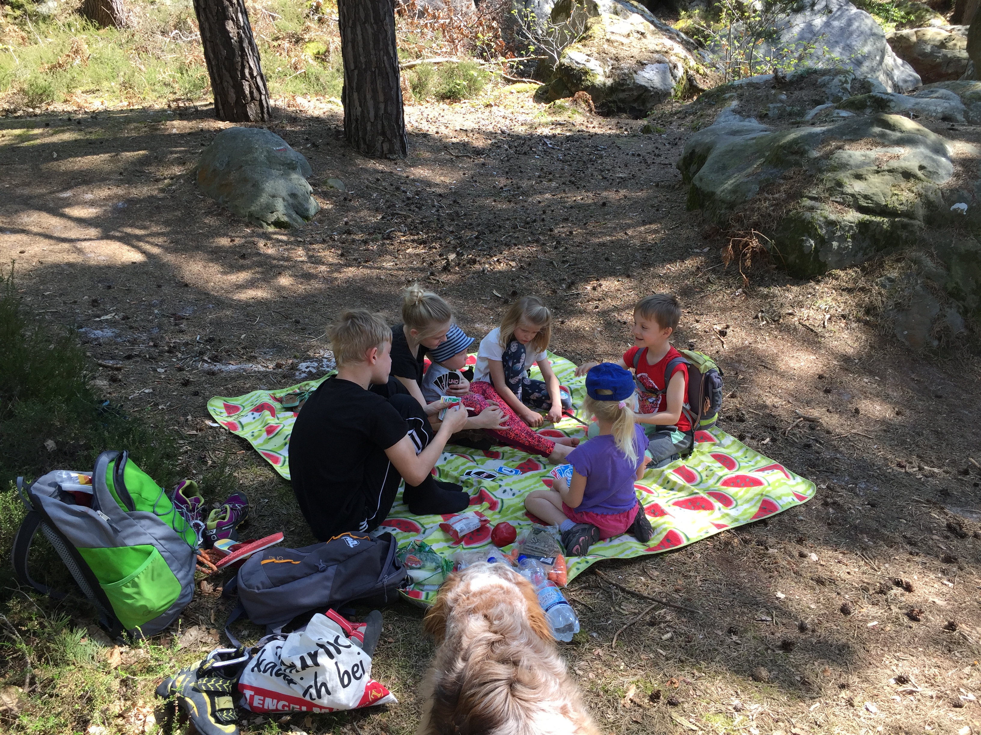 Der Kinder- Parkours sind ideal für unsere „Kleinen“ denn die Blöcke sind hier niedrig und etwas leichter zu bezwingen. Den ganzen Tag wird geklettert, oben auf einem tollen Block dann das längst fällige Picknick- Baguette was sonst, wir sind schließlich in Frankreich.